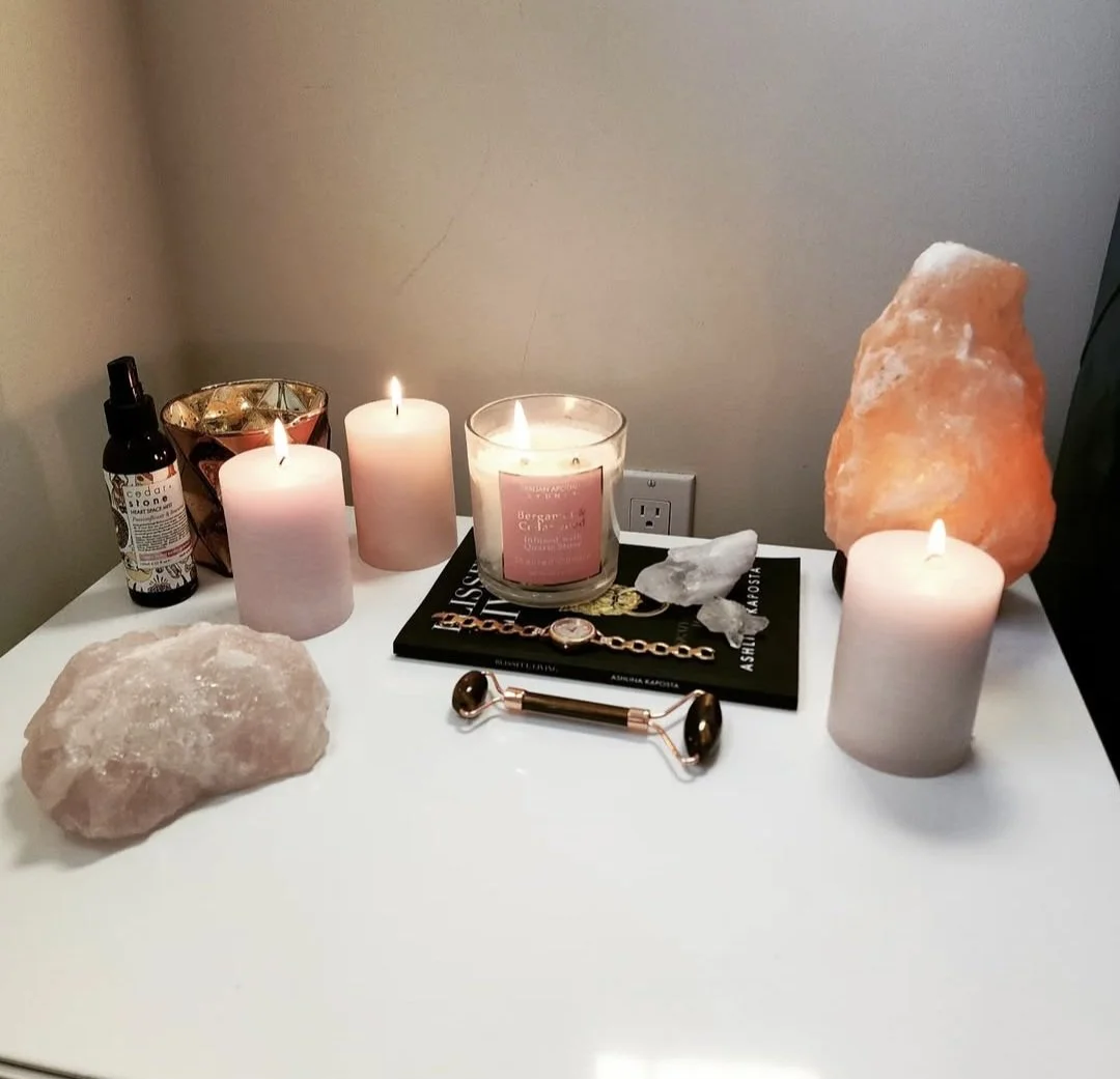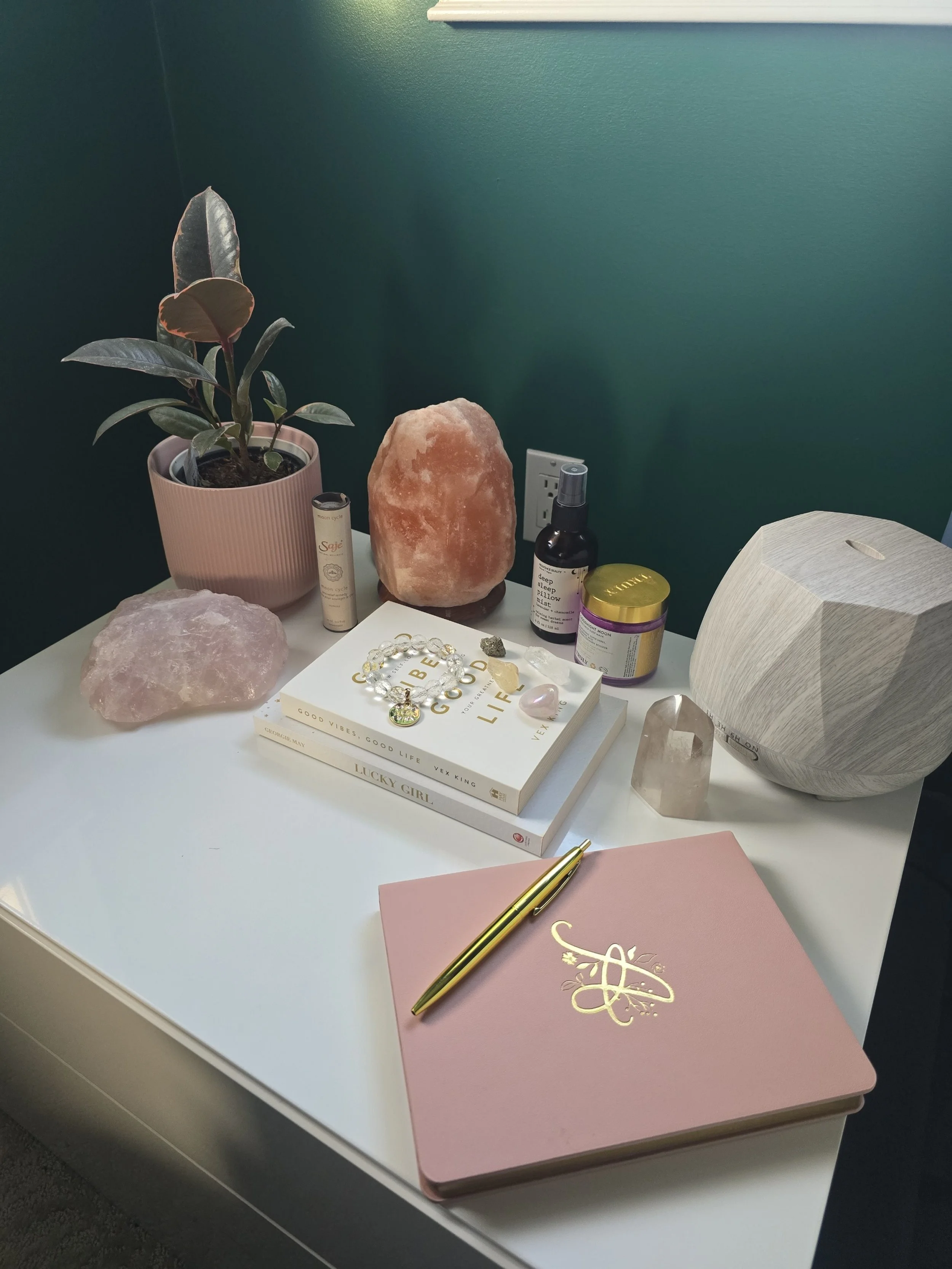 3. Add your personal touches. Add books that you love, crystals, like rose quartz to aid in peace and love, or an essential oil diffuser.